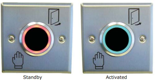 Bezdotykové infračervené odchodové tlačidlo, IP65, nastavit.detekčný dosah |
